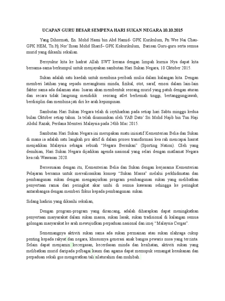 Ucapan Guru Besar Sempena Hari Sukan Negara 10 Pdf